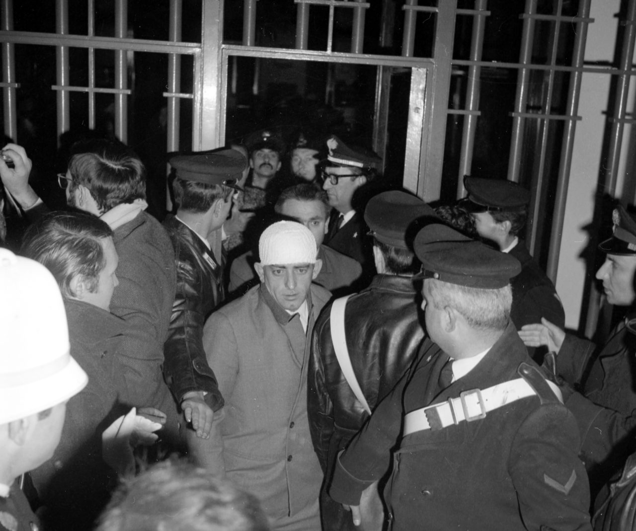 Uno dei superstiti mentre esce, con le sue gambe, dalla Banca Nazionale dell'Agricoltura (fotografia reperita su Archivio De Bellis - Fotogramma)